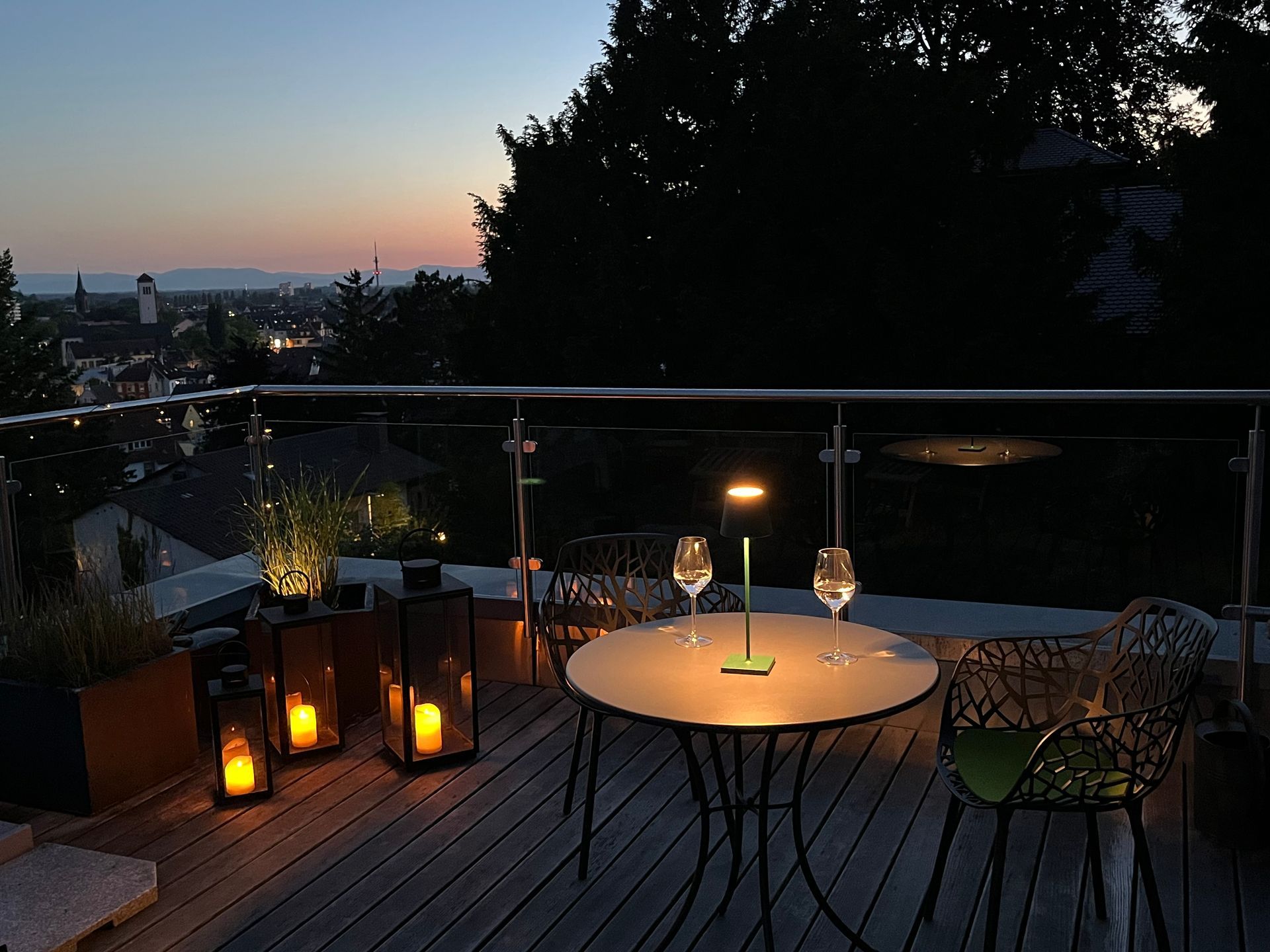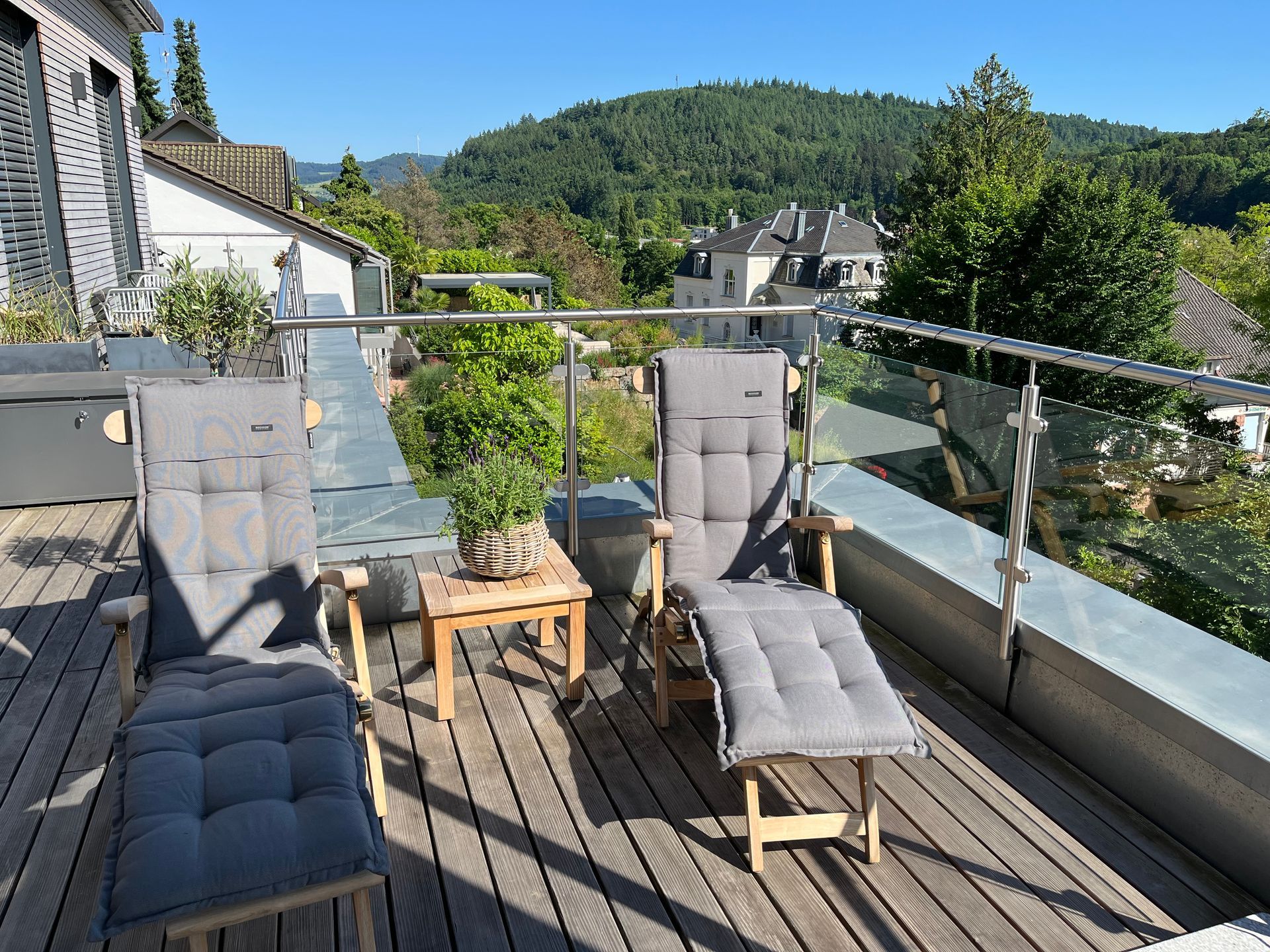 Highlight der Wohnung ist die nach Süden ausgerichtete 24 m² große Dachterrasse, die einen Rundum- Blick vom Schuttertal über die Stadt Lahr bis zu den Vogesen bietet. Hier finden Sie einen Esstisch sowie 2 komfortable Deck-Chairs mit Polstern und Beistelltisch. Für Sonnenschutz sorgt ein verstellbarer Sonnenschirm (Achtung: wegen teils plötzlich einfallender Winde nie unbeaufsichtigt offen stehen lassen).